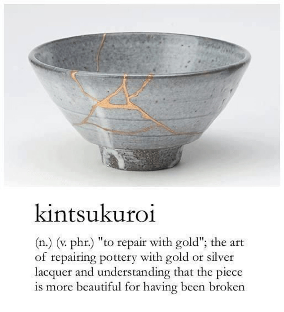 There is a Japanese art form called “Kintsugi” also known as “Kintsukuroi.” If you haven’t heard of it, it is the art of putting broken pottery pieces together again with gold.